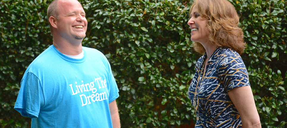 Brandon Lail laughs with Kelly Mulhern of the Caring House, which provides housing to adults treated for cancer at Duke.