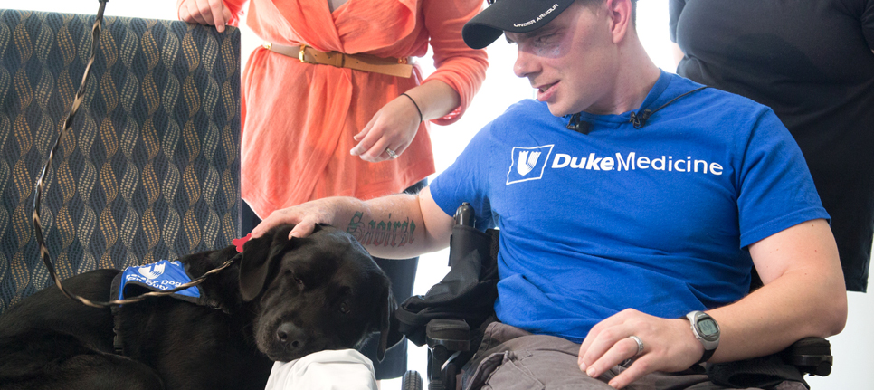 After an explosion at Ft. Bragg left Sgt. Cory Muzzy with severe injuries, the soldier returned to Duke to thank his doctors for saving his life, and the therapy dog, Kylie, for helping him through the early days of his recovery.